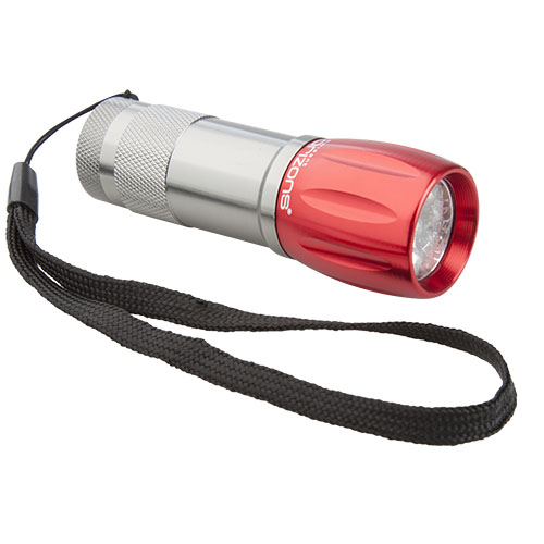 Aluminium, 9 LED lommelygte med håndledsrem. Fungerer med 3 af AAA batterier, uden batteri.