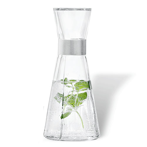 Denne karaffel er blevet populær i hele verden. I sær på grund af det enkle design i glas med stålbånd.